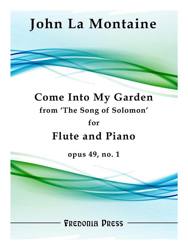In 1959, John La Montaine's composed a song cycle for soprano and orchestra titled 'Fragments from the 'Song of Songs'' based on the biblical text, 'The Song of Solomon.' From this work, he derived two works for flute and piano, 'Come Into My Garden' and 'My Beloved, Let Us Go Forth,' both of which are dedicated to Doriot Anthony Dwyer, the former principal flutist of the Boston Symphony. These two adaptations received their premiere at the 1980 National Flute Association convention in Boston. 'Come Into My Garden' is a free-flowing piece, largely based on the interval of a fourth. Though it seems like an improvisation at first, there is a structure behind it, with many recurring motives throughout.