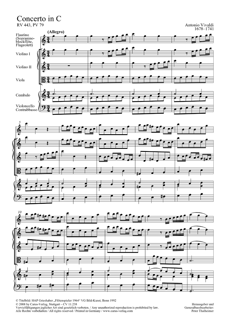 Dieses ist das bekannteste der drei Concerti per Flautino und eines der beiden in C-Dur, in den Werkverzeichnissen geführt als RV 443, PV 79, Rinaldi op. 44 No. 11, F. VI, 4. Mit dieser Neuerscheinung liegen nun alle drei Concerti Vivaldis für Sopranino-Blockflöte in sorgfältig revidierten Ausgaben bei Carus vor. - Flautino, 2 Vl, Va, Bc