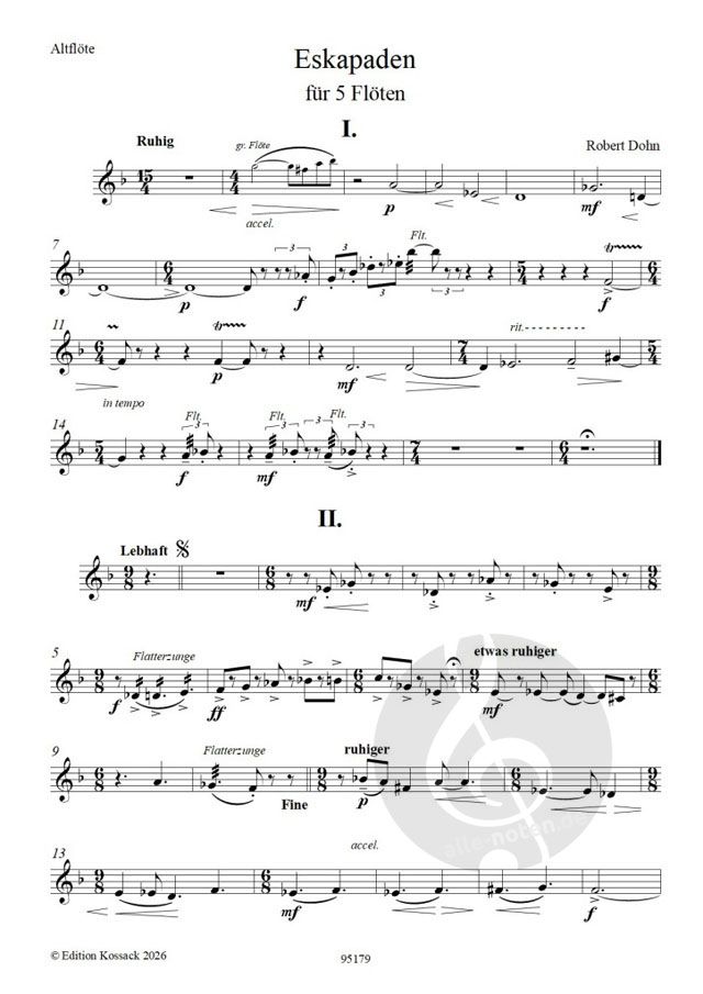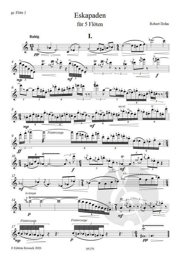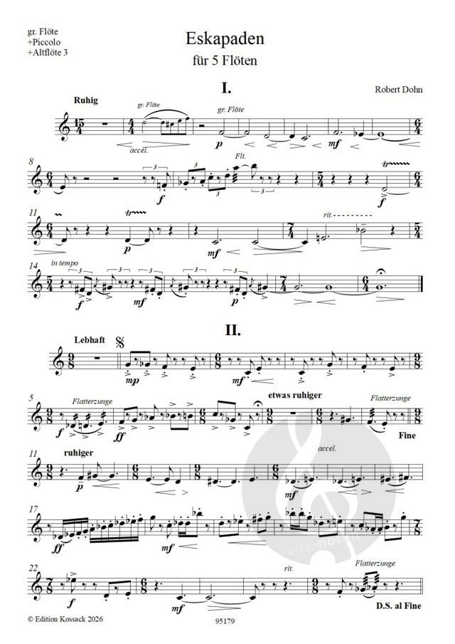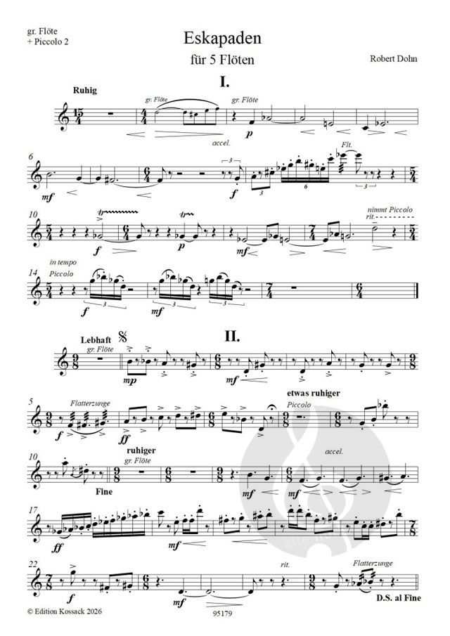 Zunächst möchte ich mich ganz herzlich bei Prof. Gaby Pas-van Riet dafür bedanken, dass sie das Stück Eskapaden für 5 Flöten meines Vaters Robert Dohn zur Wiederaufführung bringt und die Herausgabe des Werkes bei Edition Kossack möglich gemacht hat. Ebenso bin ich Herrn Wolfgang Kossack von Edition Kossack für seine Arbeit sehr dankbar und für die Gelegenheit, dieses Stück dem interessierten " Flötenvolk" bekannt und zugänglich zu machen. Robert Dohn, geboren am 13.9.1936, verstorben am 7.2.2015, war ein sehr vielseitiger Künstler: Flötist, Solist, Komponist, aber auch erfolgreicher Dozent an der Stuttgarter Musikhochschule. Er hat vielen Flötisten und Flötistinnen, unter anderem auch meiner Wenigkeit, auf ihrem Weg zu einer Anstellung im Orchester verholfen. An der Uraufführung der Eskapaden für 5 Flöten im März 1984 habe ich als 15-jährige Zuhörerin teilgenommen und war sehr beeindruckt vom vielfältigen Klangfarben-Spektrum der Flötenfamilie---und danach vielleicht noch ein bisschen verliebter in den Querflötenklang als zuvor!