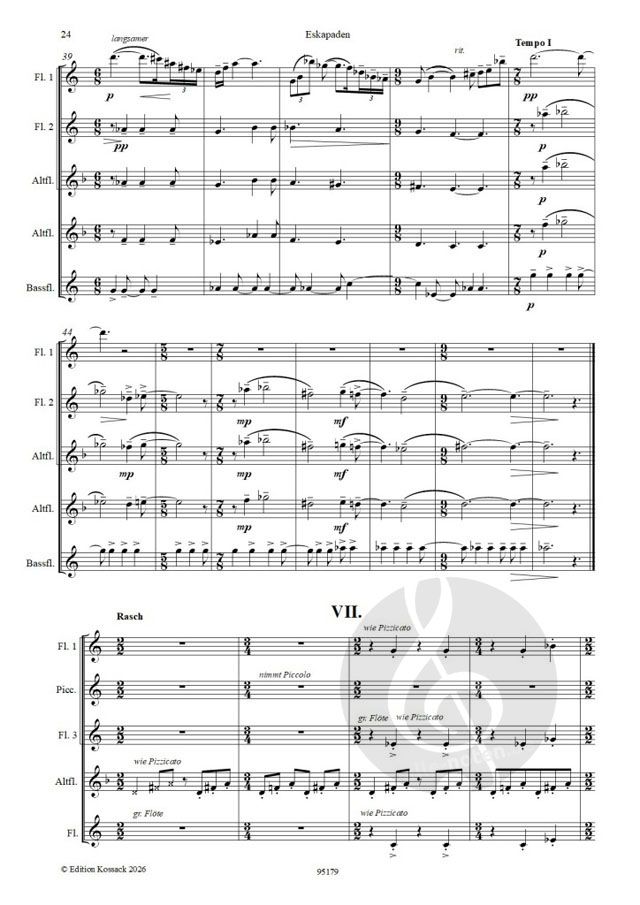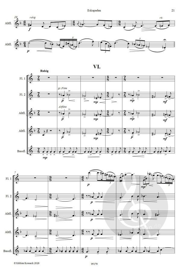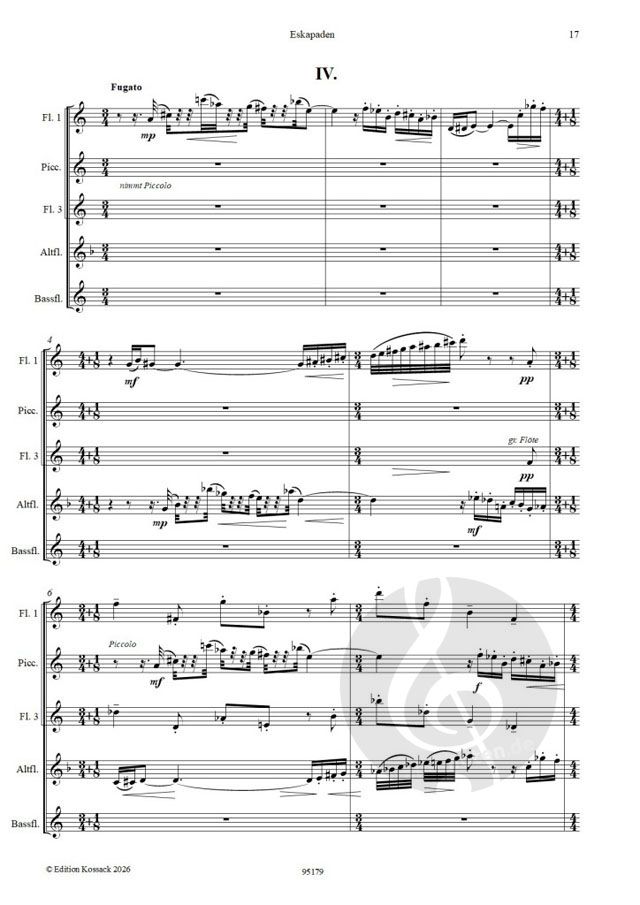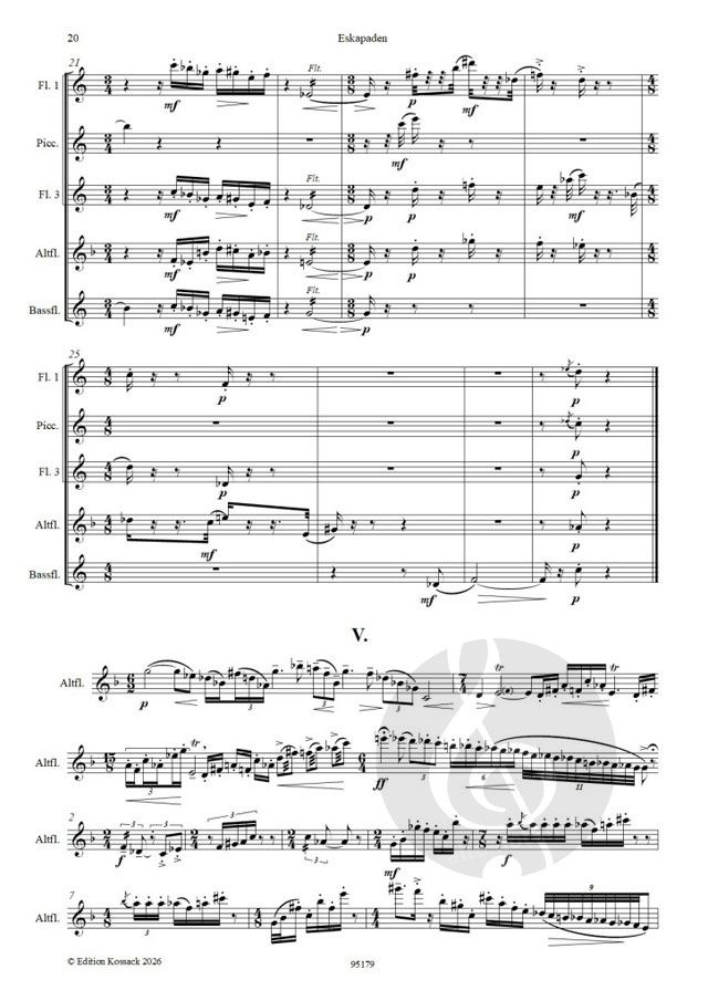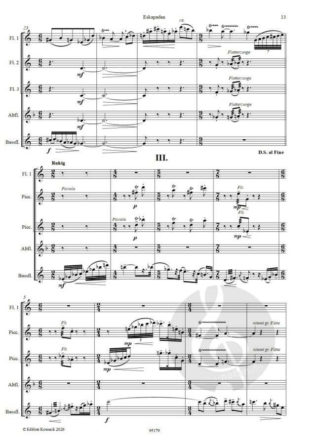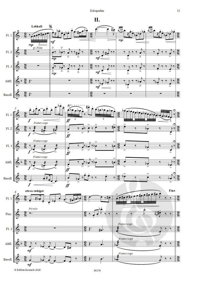 Jeder Satz bietet einem der fünf Spieler die Möglichkeit, sich voll zu entfalten. So sind z.B. für das Piccolo und die Altflöte jeweils eine Kadenz eingebaut und für jede der Stimmen gibt es einen Satz, in dem sie solistisch an der Reihe ist. Robert Dohn fand auch feine moderne Effekte, die sehr raffiniert kompositorisch eingebaut sind.