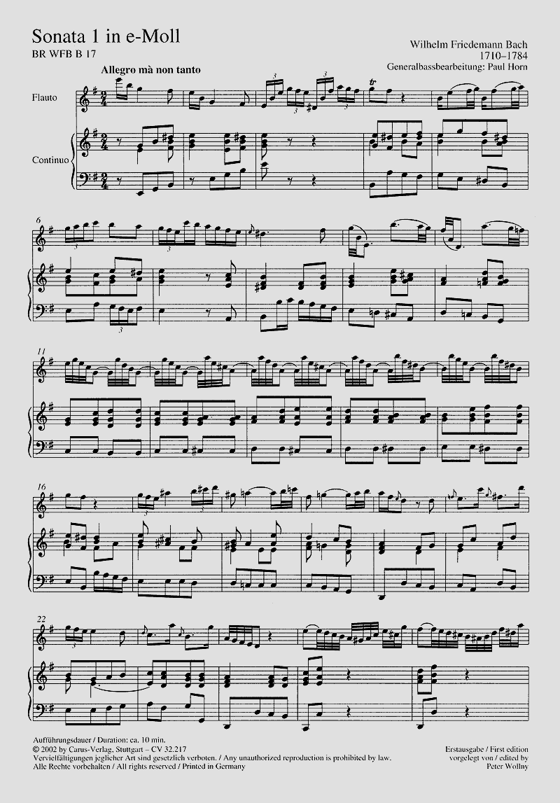 Von Wilhelm Friedemann Bach sind nur wenige kammermusikalische Werke erhalten. Umso willkommener ist daher die Entdeckung von zwei Querflötensonaten (jeweils dreisätzig in der Tempofolge schnell-langsam-schnell), die kürzlich unter den Anonyma der Staatsbibliothek zu Berlin identifiziert werden konnten. Trotz ihrer anonymen Überlieferung handelt es sich bei beiden Werken eindeutig um authentische Kompositionen W. F. Bachs, und zwar aus seiner Dresdner Zeit (1733-1746).