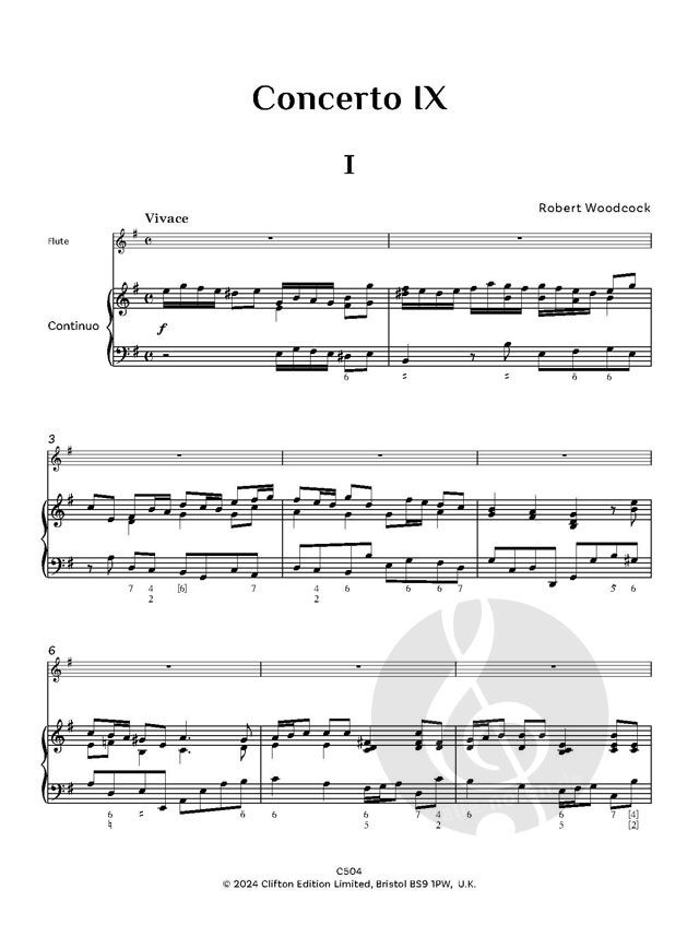 Konzert IX. Woodcocks einzige erhaltene musikalische Kompositionen sind eine Reihe von zwölf Konzerten (3 für Flöte, 3 für Blockflöte und 3 für Oboe), die um 1727 bei Walsh and Hare in London veröffentlicht wurden. Die Konzerte wurden ursprünglich unter dem Titel veröffentlicht: XII Concertos. Die drei Flötenkonzerte in dieser Reihe sind die frühesten bekannten, die für dieses Instrument veröffentlicht wurden, und die drei Oboenkonzerte sind die ersten, die von einem englischen Komponisten bekannt sind. Vivaldi veröffentlichte sein opus 10 der Flötenkonzerte kurz darauf, um 1728, und die frühesten Oboenkonzerte wurden 1715 von dem italienischen Komponisten Albinoni veröffentlicht. Dieses Konzert ist in zwei Fassungen erhältlich: C504 Klavierauszug Tastaturpartitur (Klavier/Cembalo) mit Flötenstimme. C505 Vollständige Partitur und Stimmen Enthält Partitur und Stimmensatz für Flöte, Violinen 1 & 2 und Violoncello. Die optionale Basso-Continuo-Stimme steht zum Download unter www.CliftonEdition.com/C504 zur Verfügung.