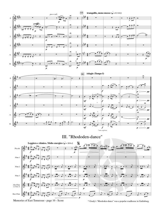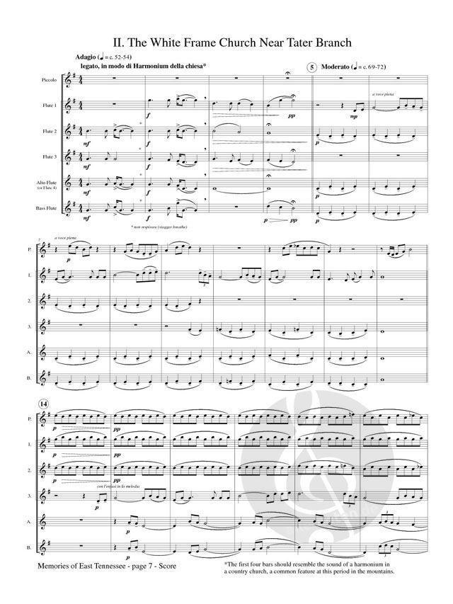 A unique work for flute choir. Movements entitled: Cades Cove in 43; The White Frame Church Near Tater Branch; and Rhododen-dance. 1995 NFA New Published Music Competition Finalist. Instrumentation: Piccolo 3, C Flutes, Alto Flute (or C Flute), Bass Flute