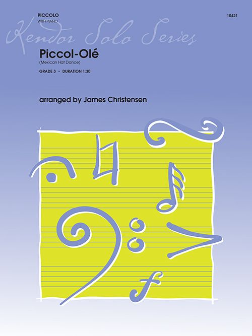 This grade 3 arrangement of Mexican Hat Dance will be loads of fun for the players and audience. Opening with a familiar bullfighting fanfare in 4/4, it then switches to the primary tune in a festive 6/8 tempo. An interlude midway through in a different key (Bb major) and meter (3/4) provides essential contrast before a recap of the main theme. Duration 1:30. Kendor Piccolo Solo with Piano Accompaniment.