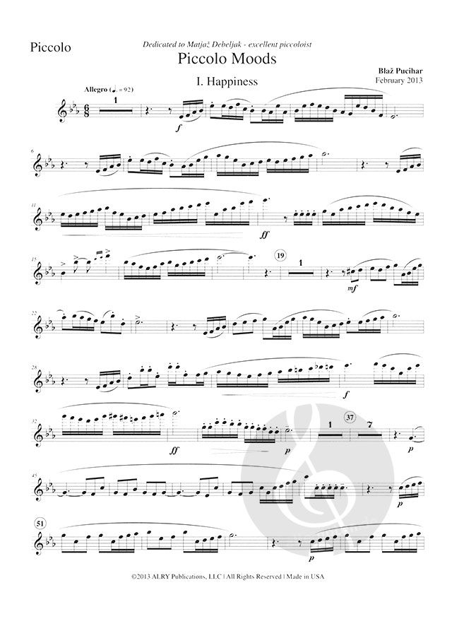 for Piccolo and Piano. Three movements (Happiness, Sorrow, Joy) written by Slovenian Blaz Pucihar for piccoloist Matjaz Debeljak. Explore the many different sides of the piccolo with this fresh new work that was premiered in February 2013. Perfect for those of you who are looking for a unique addition to your piccolo repertoire!