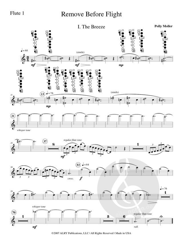 An innovative work in two movements (The Breeze; Takeoff) commissioned by the Hiller Aviation Museum in San Carlos, CA, it incorporates some extended techniques, which are clearly delineated. Scored for 2 (or more) C Flutes, Alto Flute, and Bass Flute. 2008 NFA Competition Honorable Mention.