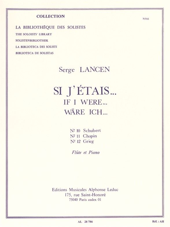If I were... by Serge Lancen is a set of easy works for Flute and Piano. Each piece was written as if the author were impersonating a famous composer and this book includes those inspired by Schubert, Chopin and Grieg. Written forupper beginners / intermediate level players, these works can all be interpreted separately. - N. 10 If I were Schubert has a slow tempo, starts Allegro Moderato and lasts 1''10 - N. 11 If I were Chopin is slower than the firstpiece, in Moderato and uses Chopin''s musical style,. Ithas an introduction and twodistinctive parts - N. 12 If I were Grieg is starts with the piano at a tempo 84. The introduction is followed by a main theme which is repeatedbefore an harmonious close If I were... can also be found with pieces inspired by Offenbach, Beethoven or Albeniz among others. Serge Lancen is a French musician and composer. He wrote numerous pieces including chamber music, orchestral works, for solo instruments and for voice. He won many radio prizes and received a Prix de Rome.