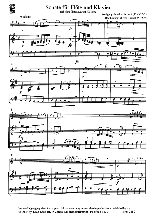 Die Literatur für Flöte und Klavier ist in der Klassik leider ziemlich klein. Von Mozart selbst gibt es an Originalwerken nur die sechs frühen Sonaten, die noch aus seiner Kinderzeit stammen.Die vorliegende Bearbeitung des in Mannheim entstandenen Flötenquartetts G-Dur KV 285a soll diese Lücke etwas füllen. Da dieses Werk technisch keine allzu großen Anforderungen stellt, ist es bereits für den leicht fortgeschrittene Spieler eine willkommene Bereicherung des Repertoires.