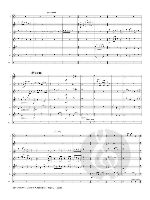 An arrangement designed to feature the various members of the flute family, but having a lot of fun along the way. Many other carols are incorporated with the main melody, and optional percussion 'toys' help identify the various days. Instrumentation: Part 1: Piccolo (divisi), Part 2: C Flute or E-flat Flute (divisi), Part 3: C Flute, Part 4: C Flute (divisi), Part 5: Alto Flute or C Flute (divisi), Part 6: Bass Flute or C Flute Percussion (optional)