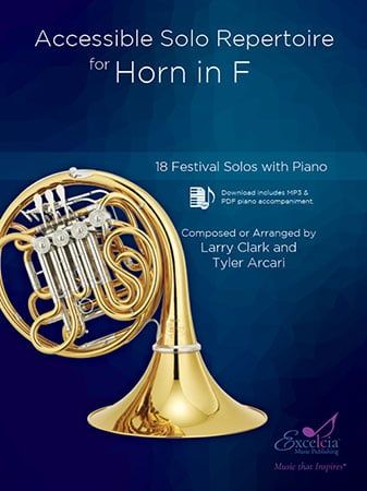 Accessible Solo Repertoire for horn contains eighteen newly composed or arranged solos with piano accompaniment written at grades 2 to 2.5. Written by one of the most popular composers of music for students, Larry Clark, and the talented up and coming composer Tyler Arcari, these solos will add something new, fresh, and different to your solo repertoire for Flute. Larry and Tyler use their experience as music educators to write solos that are fun to play and musically stimulating. These solos are perfect for use at an adjudicated solo festival or recital. Each book comes with beautifully set solo parts. Piano accompaniment parts, full recordings, and piano only recordings of each piece are available for download from the Excelcia Music Publishing website.