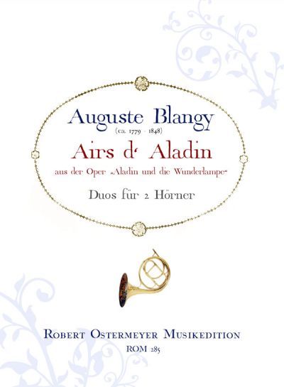 So der Titel der vorgelegten Duos für 2 Hörner. Blangy verarbeitet einige Stücke aus der Oper "Aladin und die Wunderlampe" des Komponist Nicolo ein. Unter dem Namen Nicolo verbirgt sich Nicolas Isouard (1775 -1818), welcher ein recht erfolgreicher Pariser Opernkomponist der damaligen Zeit war. Dieser verstarb aber vor Fertigstellung des Werkes und Angelo Maria Benincori (1779 - 1821) vervollständigte die Komposition. Doch auch Benincori verstarb noch vor der ersten Aufführung. 1822 wurde die Oper in Paris uraufgeführt, nach dem der Dirigent François-Antoine Habeneck (1781 - 1849) diese noch ergänzte. Blangy scheint persönlichen Kontakt zum Komponisten Nicolo gehabt zu haben, seine Duos erscheinen im Verlag von Nicolos Witwe in Paris etwa um 1822 zum ersten Mal. Eine Serie von 4 Heften mit Duos für 2 Hörner (in der Robert Ostermeyer Musikedition veröffentlicht unter ROM 136 - 139) erschien einige Jahre früher ebenfalls in diesem Verlag. Interessant und reizvoll an den Kompositionen und Arrangements Blangys ist vor allem die Tatsache, das er teilweise verschiedene Stimmungen für die Hörner vorschreibt und beide Hörner sowohl in der tiefen als auch in der hohen Lage gemischt notiert und somit die Duos recht abwechslungsreich zu musizieren sind.