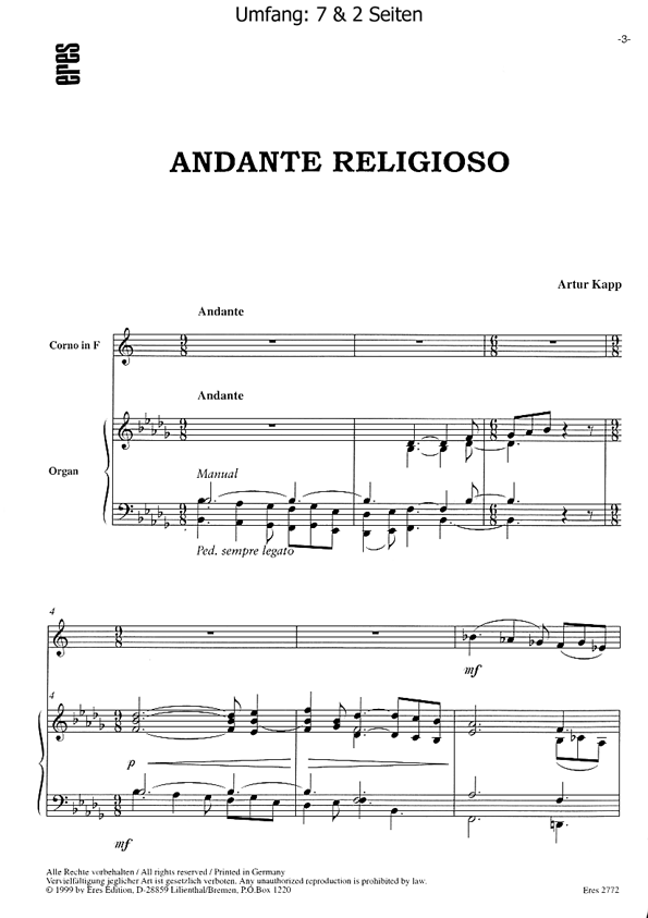 Von Artur Kapp ist bekannt, dass er ein bemerkenswert guter Organist und ein grossartiger Improvisator war. Aus diesem Grunde schuf er auch eine große Anzahl Werke für Orgel. darunter auch dieses Andante religioso. A.Kapp gab es in den Besetzungen Orgel mit Horn, Orgel mit Violine, und Orgel mit Violoncello heraus. Besinnliche und klare Melodiebögen geben dem Stück eine innige Ruhe und Behutsamkeit. Aufführungsdauer 5:30 min.Eres Estonia Edition