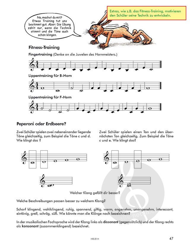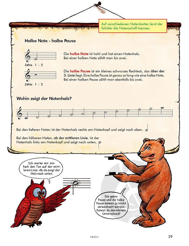 Die Motivation der Schüler wird durch spielerische Elemente gefördert. Der Einführung in die Notenlehre folgt am Ende jedes Kapitels das Noten-Quiz, um das Erlernte praktisch zu festigen und zu vertiefen. Musikalische Gruppenspiele machen den Kindern Spaß und entwickeln das Gehör und das Rhythmusgefühl.