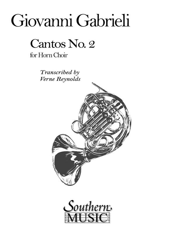 Cantos No. 2 by Giovanni Gabrieli, arranged by Verne Reynolds, is written for two advanced horn choirs, each with four parts. Movements: I. Canzona Per Sonar Primi Toni, II. Exultate, III. Canzona Per Sonar Septimi Toni