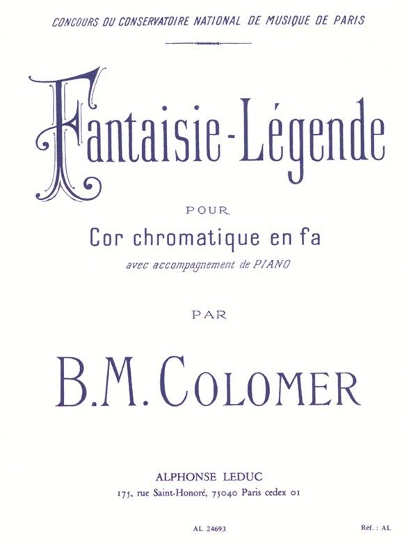 Fantaisie Légende is a chromatic work for Horn in F firstpopularised in the 1899 solo Horn contest at the Paris Conservatoire. Fantaisie Légende exploits chromatic techniques by use of complex rhythms and variations in articulation, as well aslyricalpassages. For all advanced Horn players seeking extravagant repertoire, Colomer's Fantaisie Légende provides an exciting addition to the repertoire.