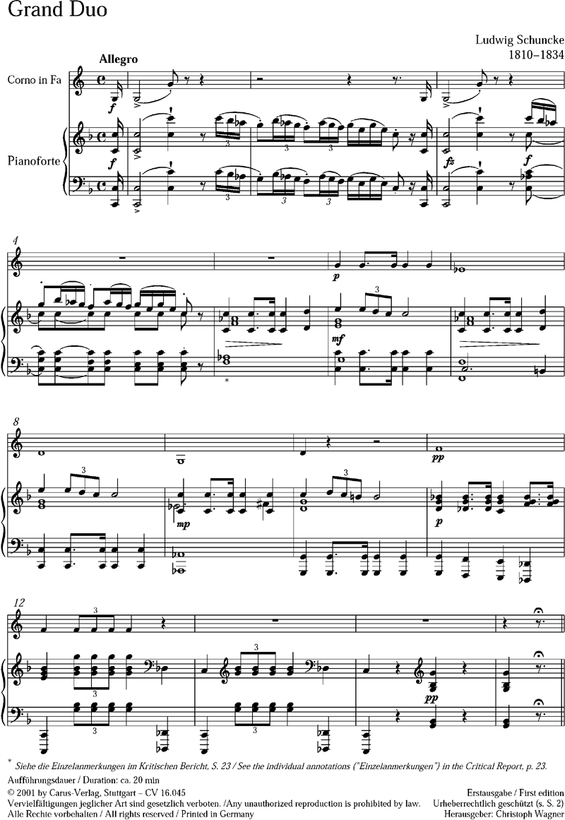 Das Duo Concertant ist in 2 zeitgenössischen Abschriften in der Handschriftenabteilung der Württembergischen Landesbibliothek in Stuttgart (Signatur Cod.mus. (2. Reihe) Fol. 102a.)24)) überliefert. Die Erstausgabe von Christoph Wagner im Carus-Verlag folgt den genannten Quellen. Drucke des Werkes oder andere Veröffentlichungen sind nicht bekannt. - Cor, Pfte