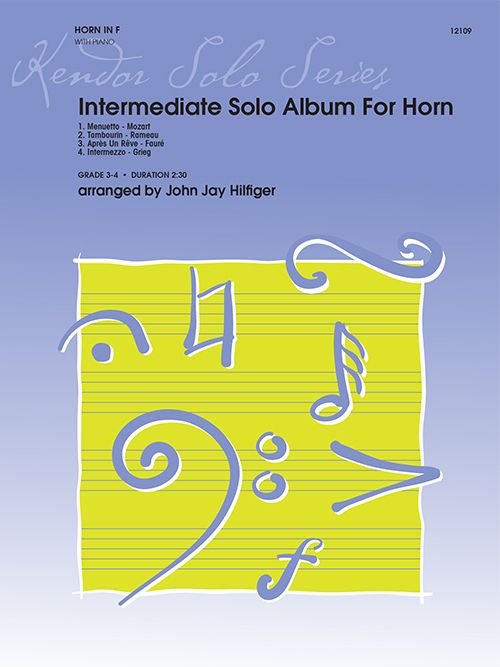 Arranged for grade 3-4 players, this interesting collection of solos in diverse styles includes: Menuetto (from Symphony No. 6, K. 43) (Mozart); Tambourin (from Pieces de Clavecin) (Rameau); Apres Un Reve (After A Dream) (Faure); and Intermezzo (Grieg). Kendor Horn In F Solo with Piano Accompaniment.