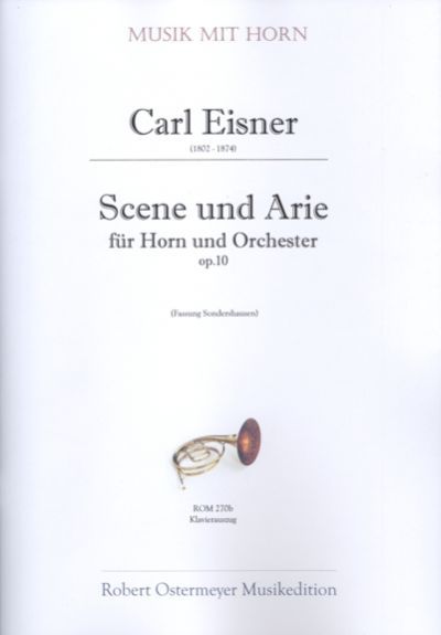 Carl (Christian) Eisner , ein Hornvirtuose des 19. Jahrhunderts, geboren am 19.7.1802 in Pulsnitz in Sachsen, erhielt seine Ausbildung in Dresden. Angestellt als Kaiserlicher Hofmusiker in St. Petersburg bis 1836 fand er doch Zeit, als Virtuose Europa zu bereisen. Eisner wird 1836 an der Hofkapelle in Dresden angestellt, gehörte dieser bis zum 1.8.1871 als 1. Hornist an und wird 1853 als wirklicher Kammermusiker genannt. Dem 1856 gegründeten Konservatorium der Musik gehörte er als erster Lehrer für Horn an. Am 22. 1. 1874 verstarb er in Dresden. Am 12. Januar 1843 trat Eisner im Gewandhaus zu Leipzig, angekündigt immer noch als kaiserlich-russischer Hofmusiker, mit dem vorliegenden Werk auf. Möglicherweise handelt es sich bei dem am 16. Dezember 1847 im Gewandhaus von Hermann Steglich vorgetragene "Concert in Form einer Gesangscene für Waldhorn" und das am 17. Februar 1848 vom Gewandhaushornisten Eduard Pohle gespielte Concertino für Horn um dasselbe Werk. Im Dezember 1843 wurde Scene und Arie op.10 beim Leipziger Verlag Kistner veröffentlicht. Widmungsträger war bei diesem Druck der Berliner Hornist Carl Schunke, der einer weitverzweigten berühmten Hornistenfamilie angehört und mit Eisner befreundet war. Das Werk, welches für das noch neue Ventilhorn (oder auch chromatisches Horn genannt) komponiert wurde, ist im Titel des Drucks für Orchester oder Pianoforte beschrieben. Die Klavierfassung hat sich in verschiedenen Bibliotheken und Sammlungen erhalten, dem Herausgeber war aber keine Orchesterfassung des Werkes bekannt. Im Juni 1898 annonciert Kistner das Werk nochmals, nun jedoch nur noch in der Fassung für Horn und Klavier.