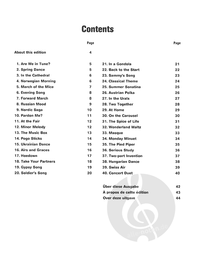 Die Duette in dieser Fortsetzung von Starter Duets führen gut strukturiert neue musikalische Elemente ein und fördern so das - schnelle Heranreifen der Schüler zu guten Musikern. Darüber hinaus werden mit den 40 kleinen Duetten wertvolle Erfahrungen im Zusammenspiel (von Lehrer und Schüler oder auch von zwei Schülern) gesammelt.