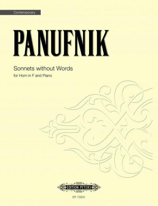 Roxanna Panufniks Sonnets without Words ist ein zeitgenössisches Stück für Horn in F und Klavier. Die Komponistin schrieb es für den Hornisten Ben Goldscheider und verwandelte darin die lyrischen Gesangslinien aus drei früheren Shakespeare-Vertonungen (Mine eye, Music to hear und Sweet Love Remember'd für Gesang und Klavier) in ein rein instrumentales Werk. Partitur und Hornstimme. Zeitgenössisches Werk für Horn in F und KlavierVertonung von Shakespeares Sonetten Nr. 8, 24 und 29 in Instrumentalform
