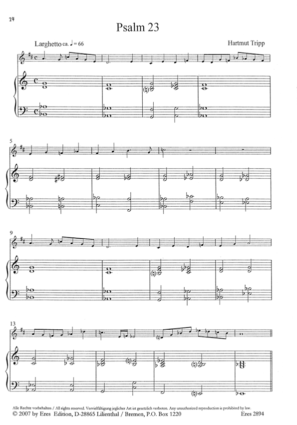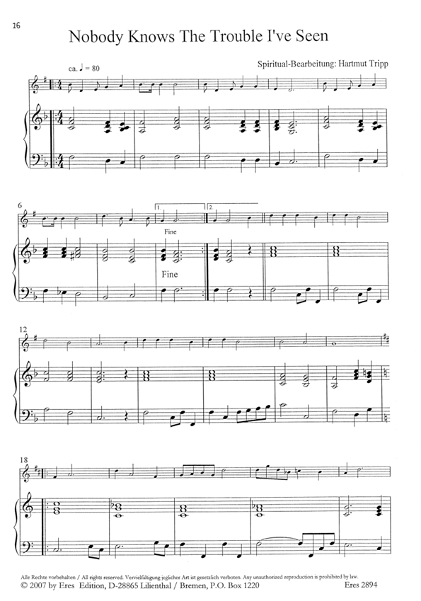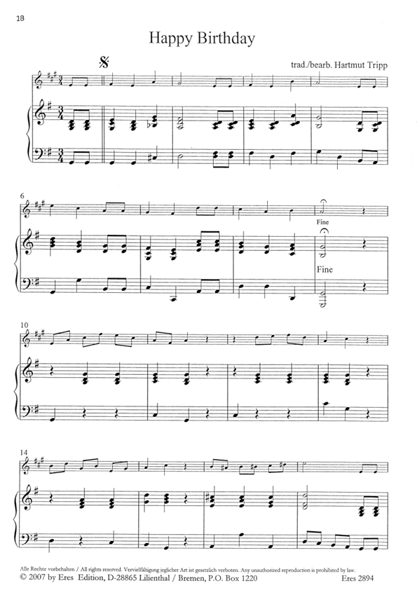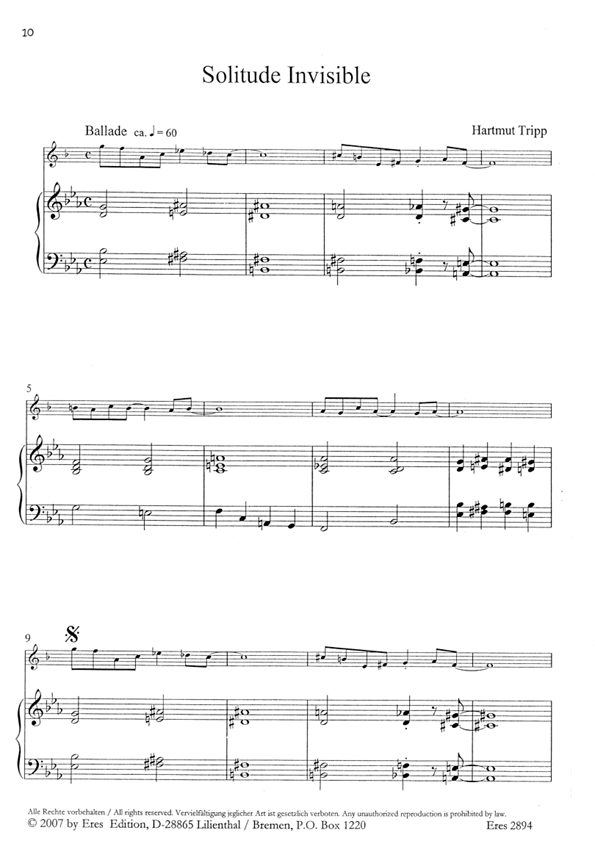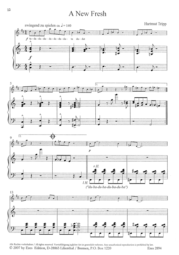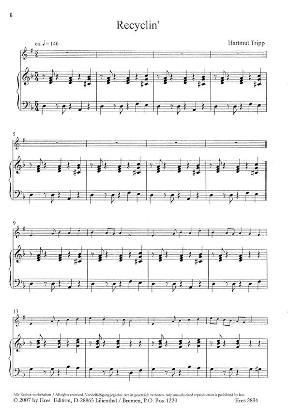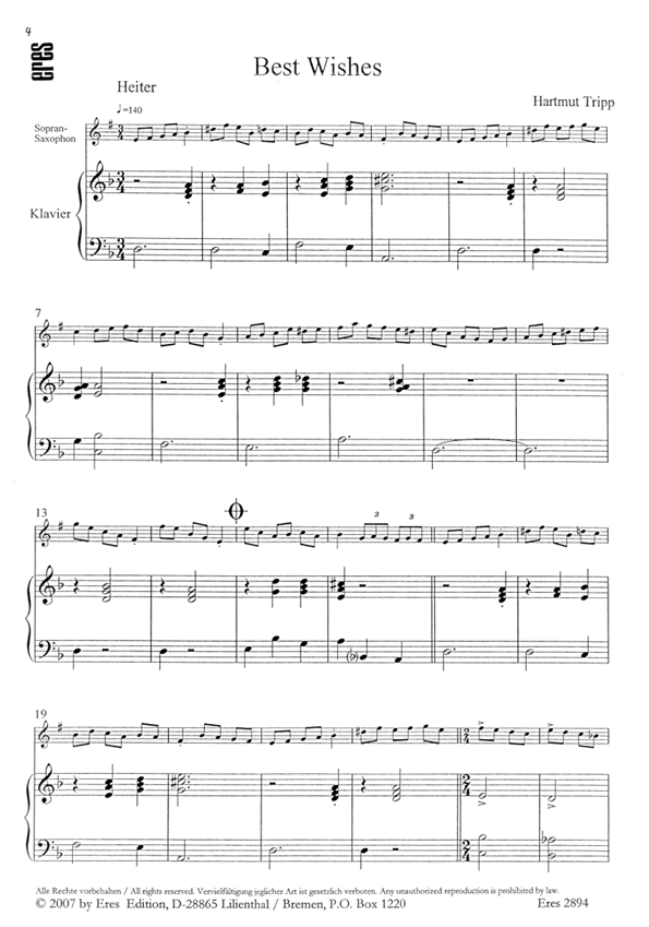 Acht Kompostitionen für Sopran-Saxophon (oder Bb-Klarinette) und Klavier.Partitur mit StimmeInhalt:Best WishesRecyclin'A New FreshPsalm 23Nobody Knows The Trouble...Happy BirthdayAfter Another EightVorwortDie vorliegenden Stücke sind so konzipiert, dass sie sich einzeln, aber auch beliebig kombiniert, für Vorspiele und Anlässe unterschiedlicher Art eignen. Sie orientieren sich am Schwierigkeitsgrad 3 (mässig schwer I gehobenes Musikschulniveau). Wichtig ist die Bereitschaft, sich 'auf ein Neues' (A New Fresh) einzulassen und eine entsprechende Musizierfreude zu entwickeln. Melodiestimme und Klavier sind völlig gleichberechtigte Partner und müssen miteinander kommunizieren.BEST WISHES Der Walzer ist im gemässigten Tempo - nicht zu schnell und nicht zu langsam - zu spielen. Ein kurzer, im 2/4Takt stehender Teil, der als Synkope (Verschiebung des rhythmischen Schwerpunkts) zu empfinden ist, leitet über in den Soloteil. Hier ist es freigestellt, die, vorgegebene Stimme zu übernehmen, oder frei zu improvisieren (s. Hinweise zum Improvisieren' - Seite 23). Auch die Anzahl der Wiederholungen liegt im eigenen Ermessen. Die Klavierstimme hat einen ostinaten (liegenbleibenden) Charakter, kann aber ebenfalls, vor allem rhythmisch - verändert oder erweitert werden. Allerdings sollte die Begleitung als sich wiederholendes Modell erkennbar bleiben.Eine Kadenz ist keine Vorschrift'. Die vorgegebenen Noten sind als Vorschlag oder Anregung zu verstehen. Wichtig ist hier der Begriff 'rubato', was nichts anderes als die Aufforderung zu einer sehr freien (und persönlich empfundenen) rhythmischen Gestaltung ist. Auf keinen Fall passt zu einer Kadenz ein metrisches Durchzählen. Es kommt hier mehr auf den Mut zur Pause und zum langen Ton als auf ein 'Feuerwerk' möglichst vieler (und schneller) Töne an.RECYCLIN' Der Titel (RECYCLIN') soll deutlich machen, dass hier ein bewährtes Muster 'wiederverwertet' wird. Wenn man sich das rhythmische Feeling von Paul Desmonds 'Take Five' mit dem Ostinat von Dave Brubeck verinnerlicht, liegt man bei 'Recyclin' richtig.SOLITUDE INVISIBLE Diese Ballade (Begriff für ein langsames Stück im Jazz) charakterisiert sich durch die jazzigen Harmonien und die einfache Melodie. Dem ersten Durchgang (16 Takte) schliesst sich ein Soloteil an, der aber - im Gegensatz zum ostinaten Charakter des Soloteils in 'Best Wishes' - genau strukturiert ist und den zugrunde liegenden Akkorden entspricht.Für die Solokadenz gilt prinzipiell das Gleiche wie bei 'Best Wishes': Rhythmisch sehr frei gestalten und Zeit lassen ! Auch hier sind der Kreativität für etwas Neues keine Grenzen gesetzt.A NEW FRESH Der aufmunternde Charakter des Titels (A New Fresh - Auf ein Neues) verlangt eine möglichst 'unbekümmerte' Spielweise. Die Achtel sind 'swingend' (also mit einem federnden 'Triolen-Feeling') zu spielen. Im Gegensatz zu klassischen Achteln sind die Achtel im Jazz generell weniger voneinander abgesetzt, sondern als fliessendes Portato zu empfinden. Am besten stellt man sich die Silben 'ta-da-da-da-da-dat' (statt - wie in der Klassik - 'tata-ta-ta-ta-tat ') vor.PSALM 23 Dieses 'Larghetto' eignet sich besonders gut für feierliche oder kirchliche Anlässe. Hier passt es am besten, wenn die Achtel gleichmässig (also nicht im Triolen-Feeling) mit 'portato' (also nicht stark angestossen) gespielt werden. Das Stück klingt, gerade auch wegen der Jazzharmonien, sehr gut mit einer Kirchenorgel (dunkles Register) als Begleitung.NOBODY KNOWS THE TROUBLE I'VE SEEN Dieser wohl bekannteste unter den nordamerikanischen Spirituals hat in dieser Version im Abschnitt C einen Soloteil, der 'hymnisch' (also mit musikalischem Pathos) gespielt werden soll. Auch dieser Teil kann beliebig wiederholt und frei gestaltet werden, allerdings sollten die Akkorde des Klaviers deutlich und 'dramatisch' klingen.HAPPY BIRTHDAY Das schon zum Volkgut gewordene Lied wird hier zu einer kleinen Rondoform verarbeitet. Die Melodie tritt zwischen zwei sehr kurzen Zwischenvariationen dreimal in Erscheinung, wobei das geschätzte Publikum - wenn denn der Anlass danach ist - natürlich zum Mitsingen animiert werden darf.AFTER ANOTHER EIGHT Das Stück lebt von seiner vertrackten Rhythmik und ist daher wohl das schwerste in diesem Heft. Der Titel deutet auf den zu Grunde liegenden 8/4 Takt hin, der sich aus mehreren Taktteilen (3 - 3 - 2) zusammensetzt. Das 'Take-Five-Feeling' ist natürlich nicht deckungsgleich zu übernehmen, sondern muss dieser Struktur angepasst werden. Im (bewussten) krassen Gegensatz dazu steht der Funk-Teil in einem etwas langsameren Tempo, der mit entsprechendem Feeling gespielt werden sollte.