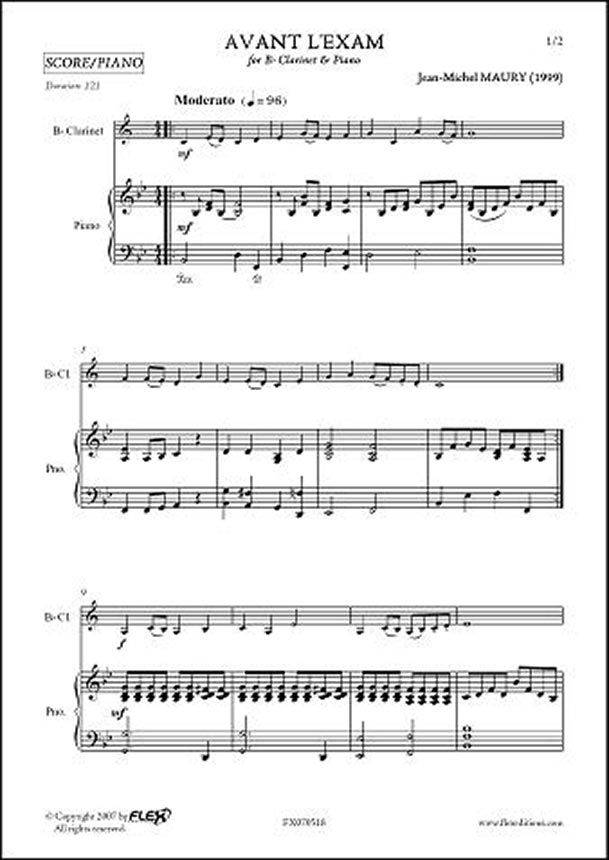 Avant l'Exam is a simple melody for clarinet, in chalumeau's range, to dialog with piano and to hold a small concert before end of cycle's exams.