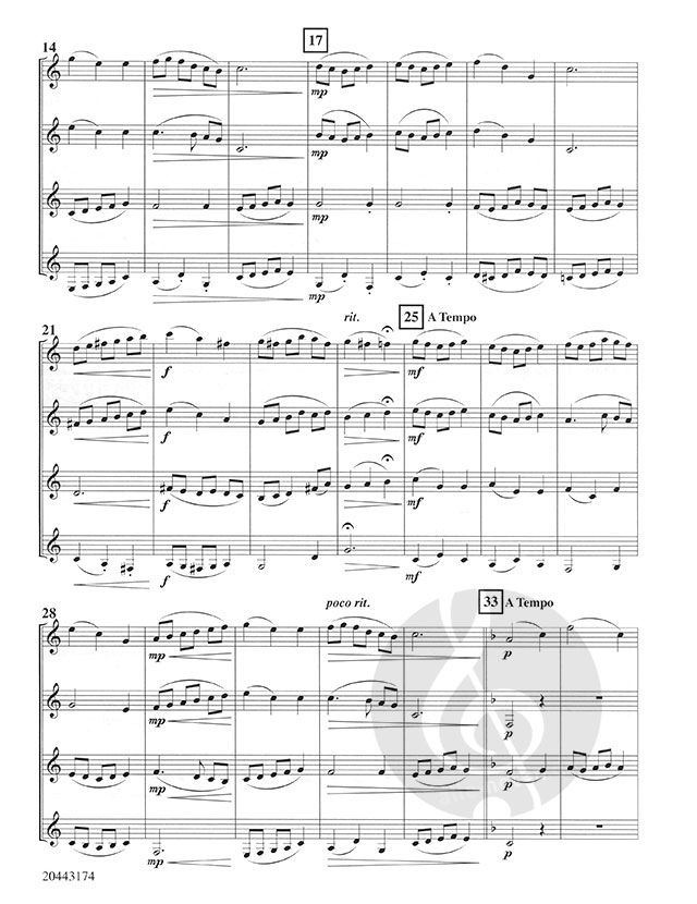 A fun and whimsical piece that gives slurred eighth note passages to all parts, but still keeps third and fourth mostly under the break. Written in the keys of C and F, there are a few accidentals in each part. With score.