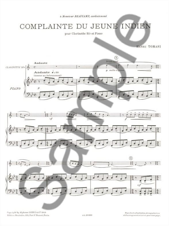 Composed in 1949 by Henri Tomasi, Lament of the Young Indian is a piece for Clarinet and Piano accompaniment. This piece voices the lament of a young Indian, expressing nostalgia. It is quite sad with an Andante tempo and theharmonic motion is quite slow. Two cadenzas feature in this work, with the possibility to cut them out to make rehearsals easier. The piece finishes sadly on the main theme which is played on last time. Written for intermediate, Lament of the Young Indian player can be used as a contest piece or for a recital. Henri Tomasi also composed 'Corsica Songs' and 'Five Profaning and Holy Songs' for Clarinet and Piano.