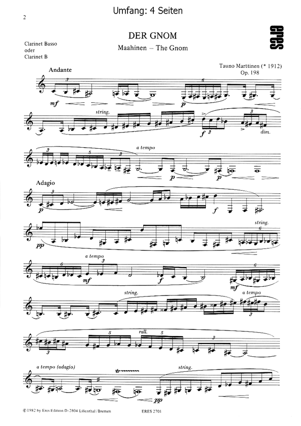 Der Gnom (Klarinette)Tauno Marttinen ist einer der international angesehenen Komponisten Finnlands. Op.198. Bass-Klarinette oder Klarinette in Bb. Auff.-Dauer: 7 min. (Maahinen - The Gnom)Musik aus Finnland