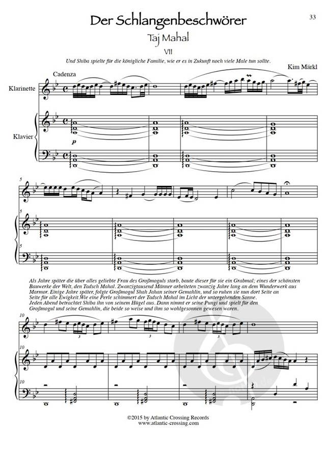 Diese faszinierende Geschichte und Musik verweben die fesselnde Geschichte von Shiba, dem Schlangenbeschwörer, mit sieben außergewöhnlichen Stücken für Klarinette und Klavier. Jede Komposition hat einen anderen Charakter, der von lyrischen Melodien bis zu berauschenden virtuosen Passagen reicht. Die Noten enthalten sowohl den Text der Geschichte als auch die Musik für Klarinette und Klavier und schaffen so ein unvergessliches Hörerlebnis, das bei Zuhörern jeden Alters Anklang findet. Die Musik kann auch ohne Erzählung aufgeführt werden.