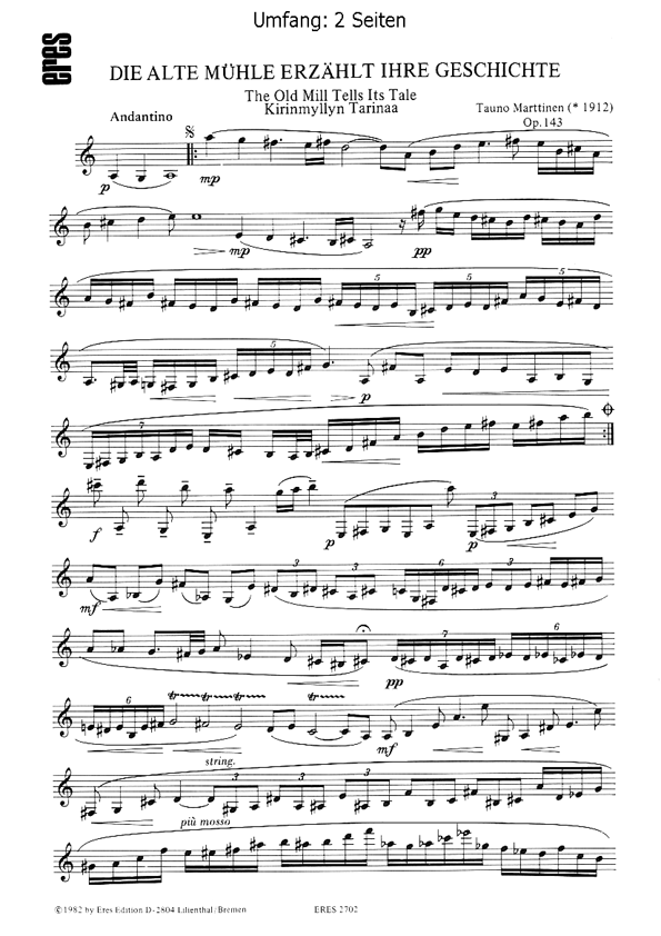 Tauno Marttinen ist einer der international angesehenen Komponisten Finnlands. Op. 143. Klarinette in Bb. Auff.-Dauer: 7 min. (Kirinmyllyn Tarinaa / The Old Mill Tells Ist Tale)Musik aus Finnland
