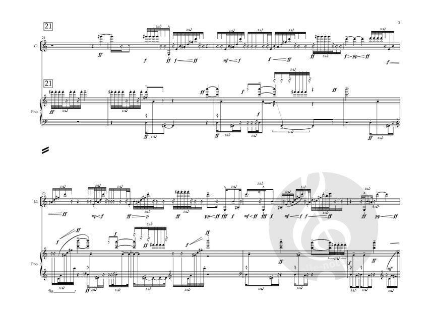Duet for Clarinet and Piano "Subconscioius light" by XIAO Xinzhou. From the composer: "The word "subconscious" came from the book "The Aesthetic Unconsciousness" by Jacques Rancière. The "light" of this piece comes from an accidental feeling that I try to grasp but is elusive... It seems that neither "subconscious" nor "light" can directly feel its concrete existence in music, and the connection between them seems indistinctive or ambiguous. To express the feeling of the relationship between these two concepts in my mind, I used my work to compose a world, deconstructed, extracted and reconstructed the integer multiple harmonics of note D in the writing process, therefore, condensing them into the pitch material of this piece and cast them on the dynamic textures. These textures take a large portion of the whole music, constantly evolving under control, which can be viewed as the intention of grasping something. Simultaneously, I arranged some appearance of harmonic series prototypes to symbolise the light I long to see."