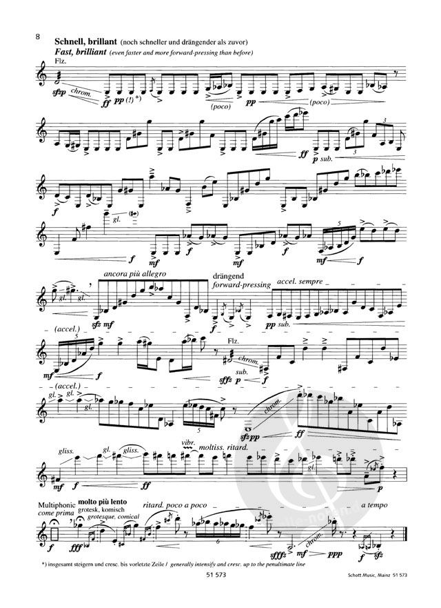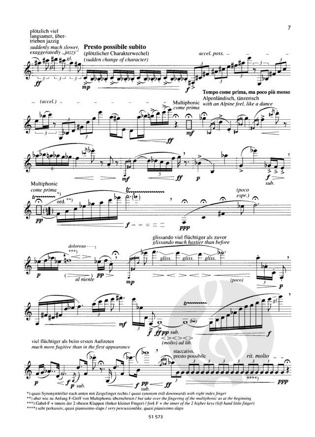 Das ganze Raffinement des zeitgenössischen Klarinettenklangs entfaltet Jörg Widmann, international gefragter Solist und Professor für Klarinette an der Musikhochschule Freiburg, in seinen Fünf Bruchstücken für Klarinette und Klavier (KLB 54) und in dieser Fantasie für Klarinette solo. Nimmt in den Fünf Bruchstücken das Geräusch als expressives Ausdrucksmittel breiten Raum ein, so geht die Fantasie durchaus vom gewohnten romantischen Wohlklang aus, dies allerdings mit ironischen Abstechern zur U-Musik-Funktion der Klarinette in Tanz-, Klezmer- und Jazzmusik. Die Fantasie für Klarinette solo ist mein erstes eigentliches Stück für mein eigenes Instrument, die Klarinette. In ihrer überdrehten Virtuosität und in ihrem heiter-ironischen Grundhcharakter reflektiert sie die Erfahrungen mit Strawinskys 3 Stücken für Klarinette solo aus dem Jahr 1919 und die klanglichen Neuerungen, wie sie erst mit Carl Maria von Webers Schreibweise für die Klarinette in die Musik kamen und denkt diese auf neue Weise weiter. Es ist eine kleine imaginäre Szene, die im Geiste der Commedia dell'arte die Dialoge verschiedener Personen auf engstem Raum vereint. - Jörg Widmann ... zur Interpretation: Wichtig wäre, dass der Titel ganz wörtlich genommen werden soll - deshalb selbstverständlich der Spieler das Stück mit Fantasie spielen sollte. Der wichtigste strukturelle Hinweis: komplette Abwesenheit von Taktstrichen - wenn ich das Stück von Studenten oder anderen vorgespielt bekomme, freue ich mich immer über eigene Ideen der jeweiligen Spieler und dass der Notentext wörtlich und ernst genommen wird in all seinen dynamischen und artikulatorischen Bezeichnungen und doch mit Leben und Fantasie erfüllt wird. Was ich allerdings immer wieder bemerke, ist, dass der rhythmische schnelle Puls-Teil oft eher wie eine Etude gespielt wird und eben nicht mit Fantasie. Mir persönlich ist es am wichtigsten selbst im strikten Timing Lust am klanglichen Differenzieren zu entwickeln. Viel Vergnügen und Fantasie mit meiner Fantasie!- Jörg Widmann