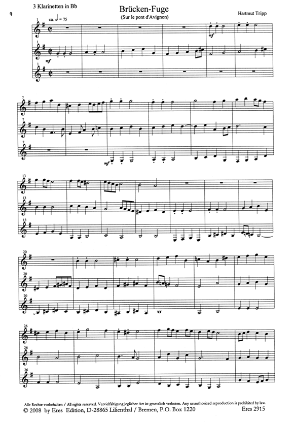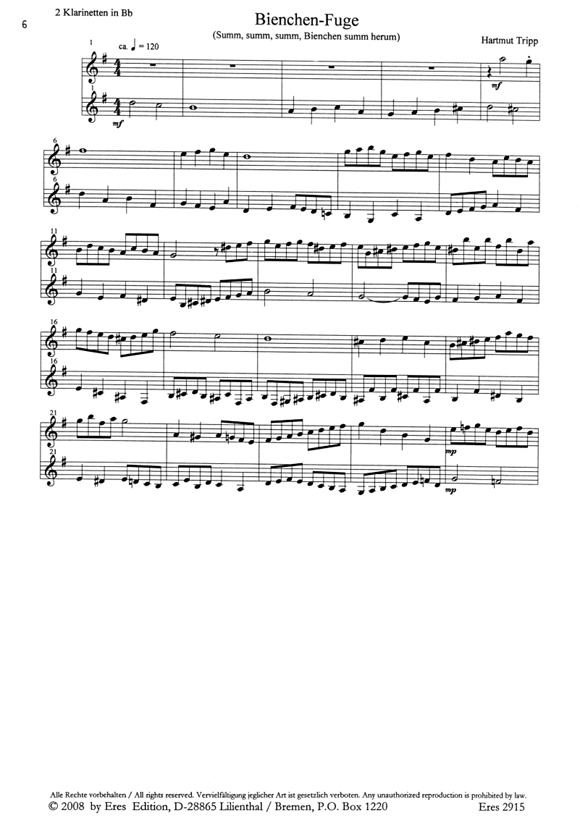 Inhalt: 1. Lenz-Fuge (3stimmige Fuge über ' Nun will der Lenz uns grüssen ') 2. Brücken-Fuge (3stimmige Fuge über ' Sur le pont d'Avignon ') 3. Bienchen-Fuge (2stimmige Fuge über ' Summ, summ, summ, Bienchen summ herum Ausgestattet mit einer Play-Along CD Partitur mit Stimmen Trackliste: 1 Lenz-Fuge alle Stimmen 2 Brücken-Fuge alle Stimmen 3 Bienchen-Fuge alle Stimmen 4 Lenz-Fuge ohne 1. Stimme 5 Lenz-Fuge ohne 2. Stimme 6 Lenz-Fuge ohne 3. Stimme7 Brücken-Fuge ohne 1. Stimme 8 Brücken-Fuge ohne 2. Stimme 9 Brücken Fuge ohne 3. Stimme 10 Bienchen-Fuge ohne 1. Stimme 11 Bienchen-Fuge ohne 2. StimmeEine Fuge fordert gleichermassen vom Interpreten und Zuhörer Aufmerksamkeit, tritt doch ein anfangs gespieltes Thema stets auf Neue in Erscheinung. Die vorliegenden Stücke verteilen sich (im Gegensatz zu der in der Barockzeit üblichen Spielpraxis mit Orgel oder Cembalo) auf mehrere Spieler, was ein besonderes Element des gemeinsamen Musizierens fördert, nämlich die Selbstständigkeit und die (musikalische) Verantwortlichkeit in der Gemeinschaft. Dabei werden den Spielern keine allzu hohen technischen Anforderungen, wohl aber rhythmisches und melodisches Verständnis abverlangt. Form und Aufbau richten sich nach den altmeisterlichen Regeln einer Fuge, enthalten also Dux, Comes und Exposition. Für die Themen wurden bewusst Melodien von Kinder- und Volksliedern gewählt, die durch ihren allgemeinen Bekanntheitsgrad schon zum 'allgemeinen Kulturgut' gehören. Hartmut Tripp