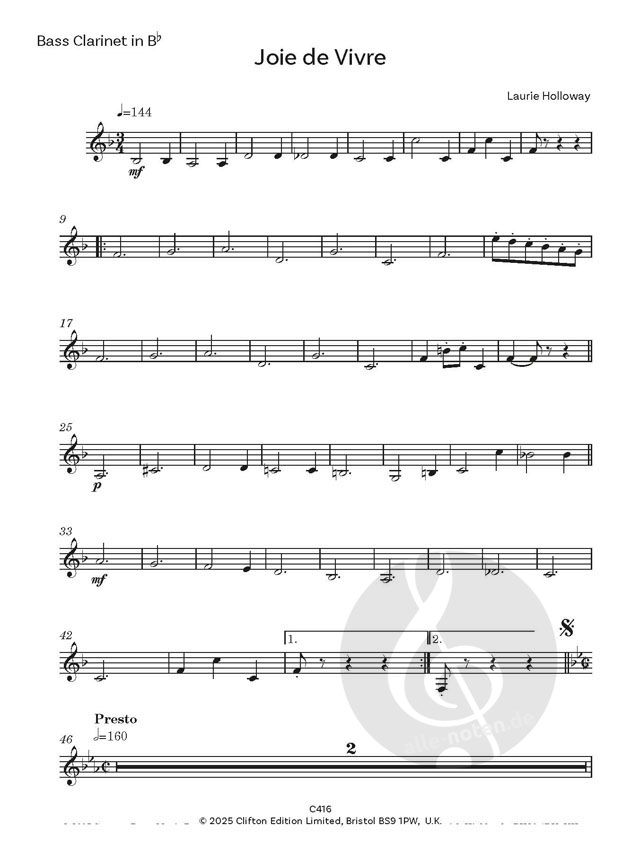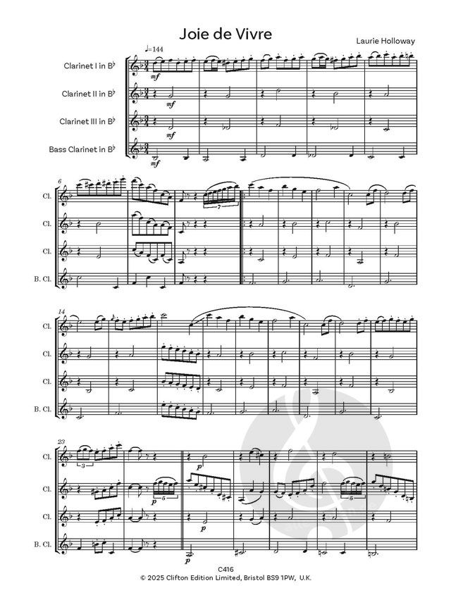 Laurie Holloway sagt: 'Joie de Vivre' spiegelt genau das wider, was ich zum Zeitpunkt der Komposition empfand. Ich fühlte mich voll des guten Lebens und glücklich, am Leben zu sein. Zum Glück fühle ich mich immer noch so. Ursprünglich war es ein Solo für mich auf dem Klavier, dann wurde es im Fernsehen von einem Flötisten in meiner Begleitung aufgeführt, und jetzt ist es da, wo es hingehört, bei Ihrem Klarinettenquartett. Die Sätze sind alle fröhlich und spiegeln hoffentlich Ihre 'Lebensfreude' wider.