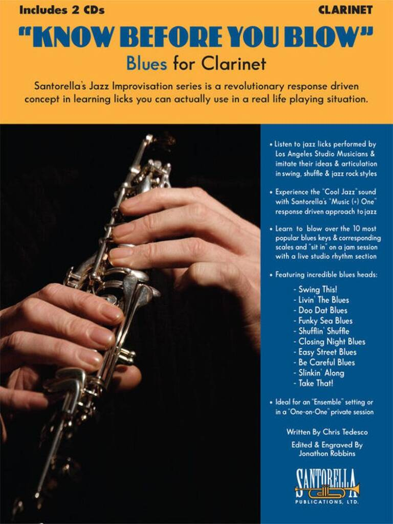 Santorella's Jazz Improvisation series is a revolutionary response driven concept in learning licks you can actually use in a real life playing situations. Most every style of Jazz is derived from some form of the Blues. It is created from a basic I-IV-V chord progression, but capable of generating an array of complex substitutions. This simple progression is found in jazz, rock, swing, shuffle, country and popular music. Learning to improvise over the blues is the key to learning to improvise over any style of music. Know Before You Blow is based upon a call & response approach to improvisation. Every scale, exercise & lick is first played by a studio professional prompting an identical response from the student. This phenomenal series, written in accommodating keys for trumpet, flute, trombone, clarinet, alto & tenor sax is ideal for private study or with any ensemble. This Santorella series is an unprecedented resource for improving one's ability to improvise in any playing situation. The three styles of focus in the Blues Edition are Swing, Jazz/Rock & Shuffle. Every style is clearly defined on the articulation pages & every scale, lick & jazz head is written in every popular key. This Blues Volume includes 2 CDs and is the nucleus of the entire method. KBYB - Blues provides the basic beginnings for any student of jazz who wants to advance to the next level. The blues has many dialects, not unlike any spoken language. While the lyrics may often deal with personal adversity, the music tells a deeper story. Most blues tunes are about overcoming hardship & adversity, expressing perseverance & optimism. From sadness, to persistence, to unbridled joy, no other form of music communicates these emotions with such clarity. All types of jazz are derived from some form of the blues. It is created from a basic I-IV-V chord progression, but it also lends itself to an array of complex substitutions. After all is said, played and done, every tune returns to the I-Chord. This simple progression is found in jazz, rock, swing, shuffle, country and even popular music. Learning to improvise over the blues is the essential foundation that every musician draws from when playing jazz and improvising in many different styles and genres. Each style is clearly defined on the articulation pages preceding each section. Every scale, exercise, chord study and jazz head is written in every popular key. The Know Before You Blow improvisational series is available to all musicians as a phenomenal resource for improving their ability to play jazz. This blues volume is the nucleus of the entire series and covers the basic beginnings for every student of jazz. Available for Clarinet, Trumpet, Flute, Alto Sa, Tenor Sax, Trombone, Rhythm Section and Conductor's Score.