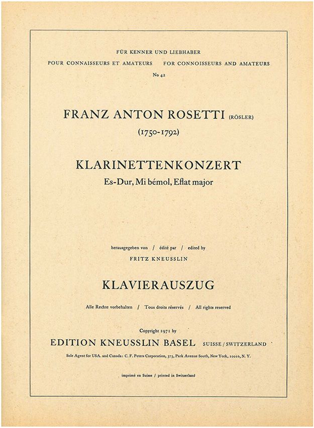 Franz Anton ROSETTI wurde 1750 in Leitmeritz (Böhmen) geboren. Er war zuerst zum Priester bestimmt, trat jedoch nach Beendigung seiner theologischen und musikalischen Studien und einem unsteten Wanderleben 1773 in die fürstliche Oettingen-Wallersteinische Hofkapelle ein. Er hiess eigentlich Rössler oder Rösler. Der damaligen Mode folgend nahm er einen italienischen Künstlernamen an. Zahlreiche Konzertreisen, namentlich nach Paris, wo er einige Werke im Druck erscheinen lassen konnte, machten Rosetti in ganz Europa bekannt. 1789 wurde er Kapellmeister des Herzogs von Mecklenburg-Schwerin in Ludwigslust, wo er 1792 verstarb. Als wichtigstes Ereignis des letzten Lebensabschnittes Rosettis ist die Aufführung seines Requiems anlässlich der Prager Trauerfeier für W.A. Mozart Ende 1791 zu nennen. Als Vorlage für unsere Ausgabe dienten die Manuskriptstimmen der Thurn und Taxischen Hofbibliothek in Regensburg, deren Benützung uns die Direktion in freundlicher Weise bewilligte, wofür an dieser Stelle der beste Dank ausgesprochen sei. In der Version für Klarinette und Klavier raten wir zu Kürzungen der langen Einleitung des ersten Satzes, die der Sachkenntnis der Ausführenden überlassen sind. Ebenso haben wir die 41 Takte Zwischenspiel (Takt 164 bis 204) nicht in den Klavierauszug genommen; die Nummerierung der Takte ist jedoch diejenige der Orchesterfassung, welche ohne Kürzung herausgegeben wurde. Fritz Kneusslin