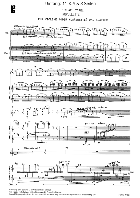 Violine oder Klarinette, Klavier. Aus dem rotieren dreier verschieden langer Tongruppen bezieht diese Musik anfangs ihren Impuls. Die drei Gruppen bestehen ausm 3, 4 und 5 Tönen, die zusammen genommen das zwölftönige Total ergeben.Für Violine oder Klarinette in A und Klavier.