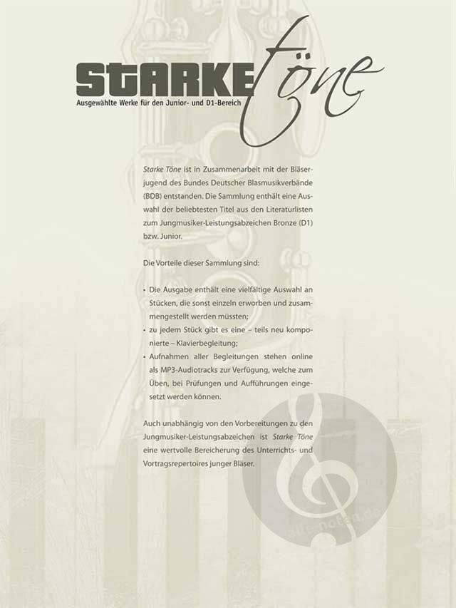 Starke Töne ist eine Sammlung, die in Zusammenarbeit mit der Bläserjugend des Bundes Deutscher Blasmusikverbände (BDB) entstanden ist. Die Sammlung enthält eine Auswahl der beliebtesten Titel aus den Literaturlisten zum Jungmusiker-Leistungsabzeichen Bronze (D1) bzw. Junior. Die Vorteile liegen dabei klar auf der Hand: Die Instrumentalisten sparen mit diesem Buch nicht nur wertvolle Vorbereitungszeit, sondern auch bares Geld, denn wer früher mehrere Hefte anschaffen musste, hat mit Starke Töne bereits das Beste in einem Band versammelt. Somit befriedigt diese Ausgabe eine lang bestehende Nachfrage. In jeder Ausgabe ist jedes Stück mit einer Klavierbegleitung notiert; ursprüngliche Solostücke wurden eigens mit einer neu komponierten Begleitung versehen. Der Klavierpart ist in der Regel einfach bis mittelschwer, sodass die Begleitung auch von fortgeschrittenen Klavierschülern übernommen werden kann. Ein großer Vorteil für die Vorbereitung auf die praktischen Leistungsprüfungen ist das jedem Heft beiliegende Audio-Online-Angebot, welches die auf einem echten Konzertflügel aufgenommenen Klavierbegleitungen enthält. Neben Einspielungen im Originaltempo sind die meisten Stücke zum leichteren Einstudieren auch in einer weiteren Version im langsameren Tempo zu hören. Mit Starke Töne ist in Zusammenarbeit mit dem BDB eine wertvolle Sammlung für alle Blasinstrumente und Klavier sowie für Schlagzeug entstanden, die selbstverständlich auch unabhängig von den Leistungsabzeichen das Unterrichts- und Vortragsrepertoire für jede dieser Besetzungen bereichert.