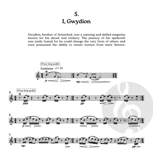 Das Mabinogion ist eine Sammlung der ältesten walisischen Prosaerzählungen, die im 12. bis 13. Jahrhundert auf der Grundlage früherer mündlicher Überlieferungen in Mittelwalisisch verfasst wurden. Die Stücke von Francis Faux sind der Klarinettistin Emma Davies gewidmet und wurden von ihr uraufgeführt. Im letzten Stück kommt ein "Loop Pedal" zum Einsatz.