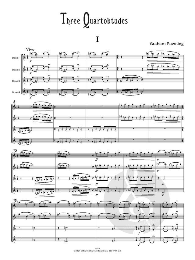 Three Quartobtudes (1983) wurde auf der International Double Reed Convention in Florida, USA, mit dem Komponisten im Ensemble aufgeführt. Der Titel erinnert an Graham Pownings Freude an kryptischen Kreuzworträtseln, insbesondere während langer Proben im Sydney Opera House! Die Musik hat einige Merkmale von Bartok übernommen, vor allem parallele Sekunden und ruckartige Rhythmen.