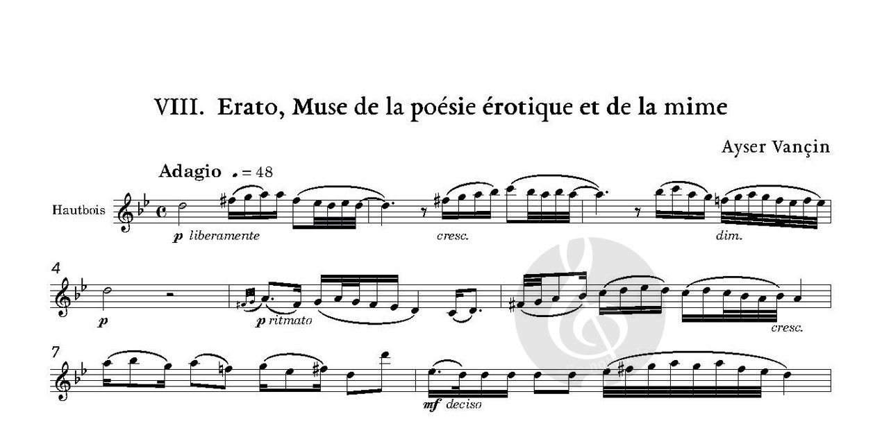 Ich wurde zu diesem Werk inspiriert, nachdem ich ein Seminar über griechische Mythologie an der Universität Genf besucht hatte: eine Sammlung von Solostücken für Oboe oder Englischhorn, die dem Interpreten eine gewisse Freiheit der Improvisation lassen. Die Musen werden in der altgriechischen Kunst oft mit Musikinstrumenten oder anderen Gegenständen dargestellt.