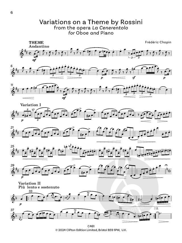 Nicht ganz so eindeutig ist die Herkunft von Chopins Variationen über ein Thema aus Rossinis Oper La Cenerentola - ursprünglich für Flöte. Es ist nicht eindeutig bekannt, für wen sie geschrieben wurden, aber sie könnten entweder für seinen Vater (der Flöte spielte) oder für seinen engen Freund Matuszynski bestimmt gewesen sein. Sie stammen aus den Jahren 1826-30 und wurden hier für die Oboe von E-Dur nach D-Dur transponiert, was eine wertvolle Ergänzung des Repertoires des Oboisten im 19.