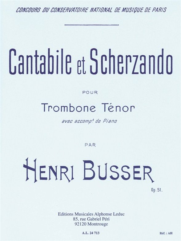 French composer, Henri Büsser entered the Paris Conservatoire in 1889. He won the 1893 Prix de Rome and led a highly successful career as a composer, conductor, teacher and organist. His compositions for a variety of instrumentsare exceptional, Cantabile and Scherzando for Trombone and Piano being no exception. As reflected in Cantabile and Scherzando, Büsser's compositional style was sophisticated, yet true to the 19th century French tradition. Elements of the Cantabile include include, legato phrasing, dotted rhythms and triplets, superbly contrasted in the Scherzando by staccato rhythms, a quick tempo and scalic passages. For all advanced Trombone players, Büsser'sCantabile and Scherzando is essential to a varied repertoire.