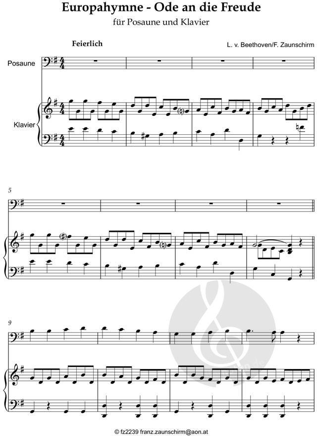 Ein klassisches Arrangement von Beethovens Melodie mit einfacher Klavierbegleitung, das eine würdige und optimistische Stimmung erzeugt.