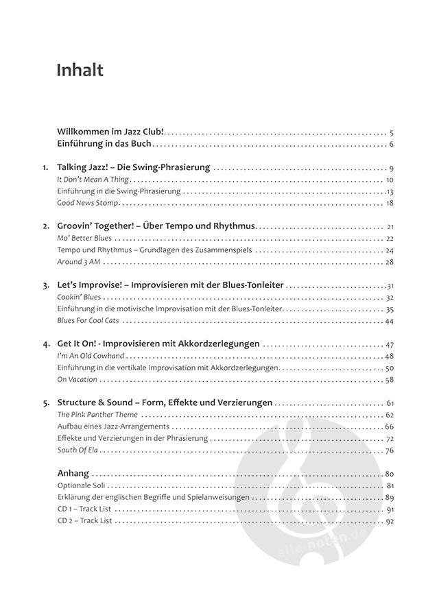 JAZZ CLUB ermöglichlicht einen spielerischen Einstieg in den Jazz und soll die oft vorhandene Schwellenangst vor Improvisation und Jazz-Theorie nehmen. Interessierte können erst einmal 10 groovige Stücke verschiedener Stilistiken zu den Play-alongs spielen und so mit dem 'Sound' des Jazz vertraut werden. Soli, Akkorde und Rhythmik sind ausgeschrieben, man kann, aber muss nicht, selbst improvisieren oder frei begleiten. Die Stücke sind in 5 Kapitel mit je einem jazz-spezifischen Thema zusammengefasst. Wer tiefer in die Materie eintauchen will, findet Übungen samt Play-alongs zu den Themen Jazz-Phrasierung, Tempo & Rhythmik, Improvisation, Form & Effekte. Die Ausgaben gehen also den Weg 'vom Stück zur Theorie' und nicht umgekehrt.