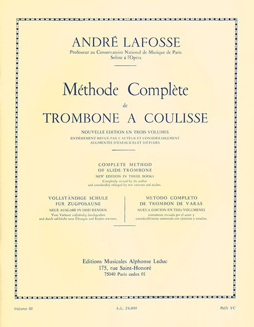 André Lafosses Vollständige Schule für Zugposaune Band 3 ist der letzte Band dieser Serie, mit Kommentaren und Erklärungen für Zugposaune, und wurde 1921 für Spieler der oberen Mittelstufe geschrieben. Diese vollständige Methode enthält verschiedene Übungen und Studien und zeigt dem Spieler die richtigen Positionen, die er einnehmen muss, um einen sauberen Klang auf dem Instrument zu erzeugen. Die vollständige Methode für Zugposaune wurde in drei Bänden geschrieben, die ersten beiden 1921 und der letzte 1946, und die Bassposaune wird in einem dreiseitigen Anhang behandelt. André Lafosse (1890-1975) war Posaunist und Professor am Pariser Conservatoire. Er komponierte auch eine Suite für Blechbläserquintett namens Suite Breve und machte Aufnahmen mit Strawinsky.