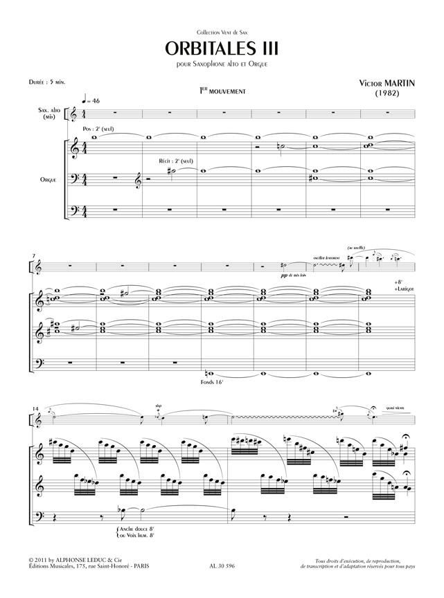 Orbitales III (5') (9e) (collection vent de sax) pour saxophone alto et orgue. Par Martin V. aux éditions Leduc. Partition / Livre de chansons pour Saxophone