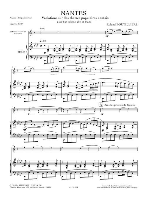Nantes (4'50'') variations sur des thèmes populaires nantais pour saxophone alto et piano (préparatoire 2). Par Boutilliers aux éditions Leduc. Partition / Livre de chansons pour Saxophone