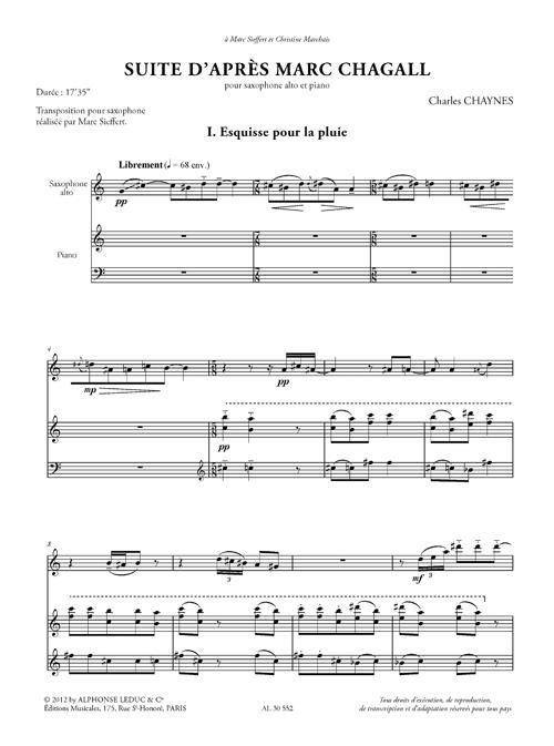 Suite d'après Marc Chagall (17'35'') pour saxophone alto et piano (transposition pour saxophone par m. sieffert). Par Chaynes aux éditions Leduc. Partition / Livre de chansons pour Saxophone